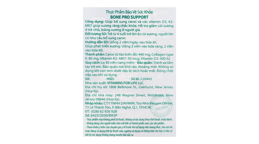BONE PRO SUPPORT được bào chế và sản xuất tại Vitamins For Life, USA (Mỹ), với thành phần chiết xuất từ thảo dược (extract) dược tính cao, tuân thủ tiêu chuẩn an toàn của FDA (Mỹ), tinh chất 100% thiên nhiên, giúp hấp thu nhanh, không tác dụng phụ, không chất bảo quản.