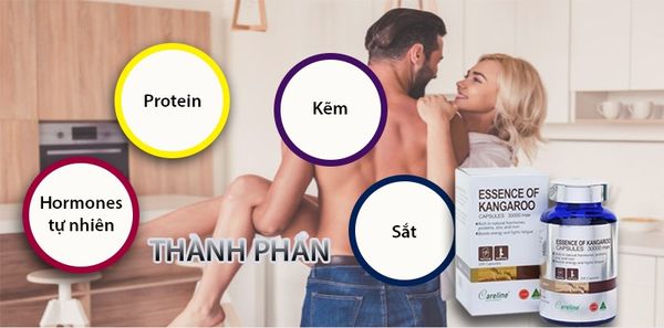 - Sản phẩm Essence of Kangaroo 60 viên có thành phần dưỡng chất chủ yếu là Protein, kẽm và sắt. Không chứa : đường, lactose, tinh bột bắp, men vi sinh, gluten, muối, hương tổng hợp và chất bảo quản.