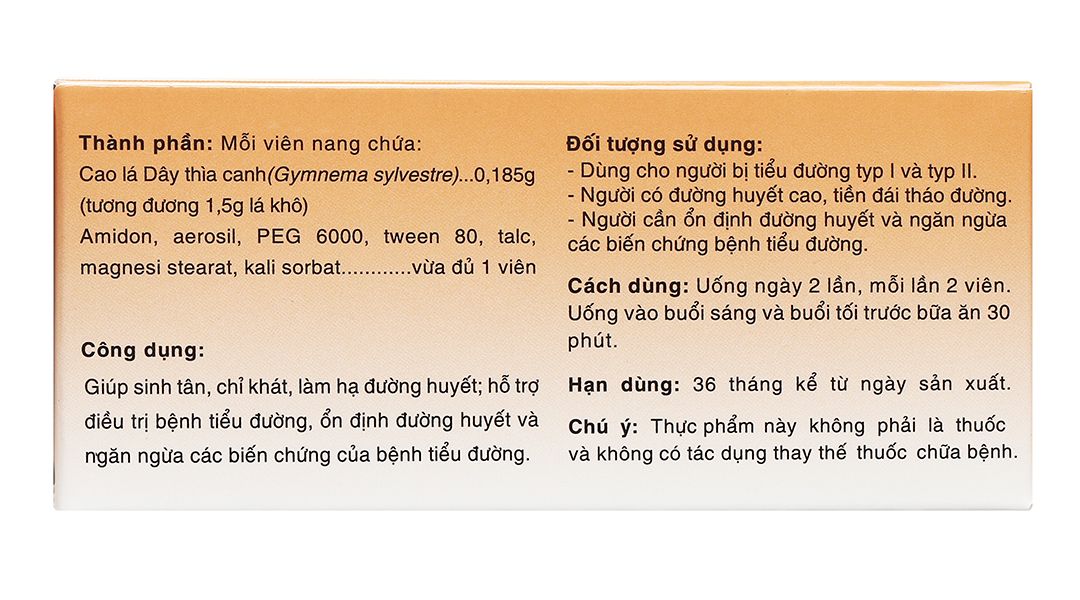 - Hoạt chất: Cao lá Dây thìa canh (Gymnema sylvestre): 0,185g (tương đương 1,5g lá khô).