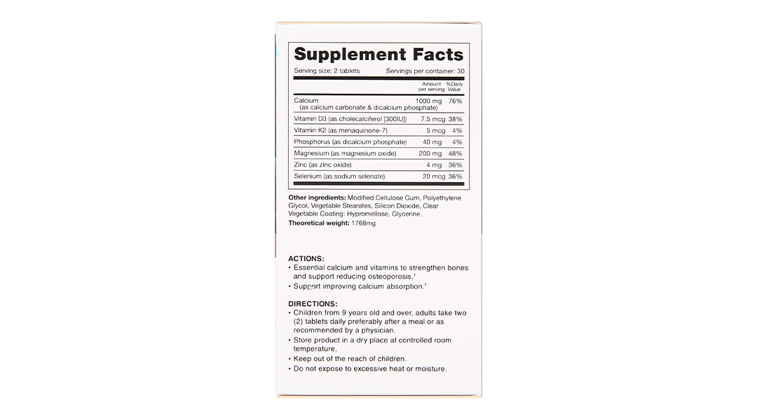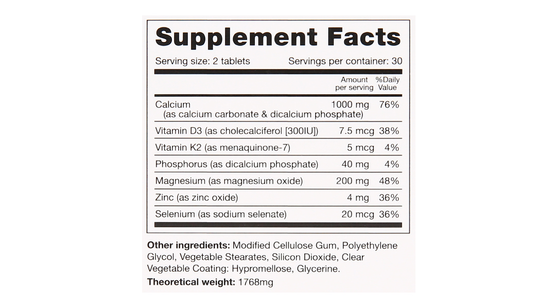 - Canxi (từ Canxi carbonate và dicanxi phosphate) 1000mg; Magie (từ Magie oxit) 200mg; Photpho (từ dicanxi phosphate) 40mg; Kẽm (từ Kẽm oxit) 4mg; Selen (từ Natri Selenate) 20mcg; Vitamin D3 (Cholecalciferol) 7,5mcg (300IU); Vitamin K2 (Menaquinone-7) 5mcg.