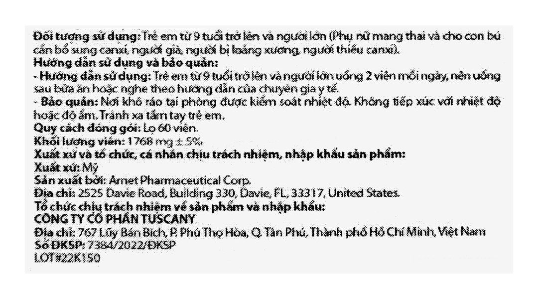Công dụng | Bổ sung canxi và một số vitamin giúp xương chắc khỏe, hỗ trợ giảm nguy cơ loãng xương. |