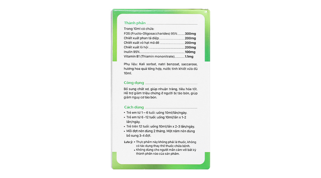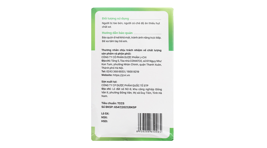 Đối tượng sử dụng | Người bị táo bón. Người có chế độ ăn thiếu hụt chất xơ |