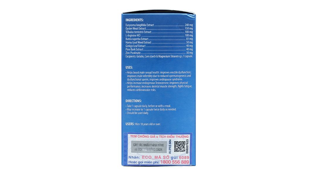 Hỗ trợ tăng testosterone nội sinh, nâng cao thể trạng, tăng cường lực cơ, chống mệt mỏi, giảm nguy cơ tim mạch.
