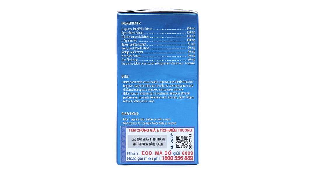 Hoạt chất: Eurycoma longifolia extract 240mg, Oyster meat extract 150mg, Tribullus terrestris extract 100mg, L-Arginine HCL 100mg, Butea superba extract 81mg, Horny goat weed extract 50mg, Ginkgo leaf extract 40mg, Pine bark extract 40mg, Zinc picolinate 30mg