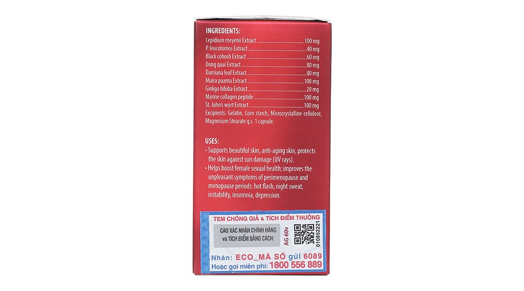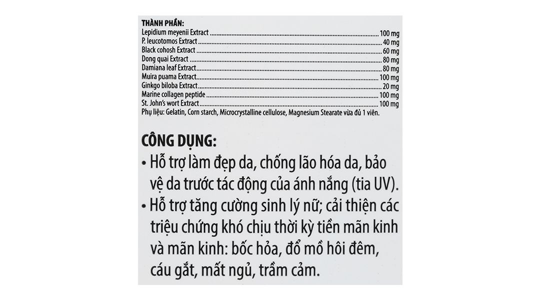 Hoạt chất: Lepidium Meyenii Ginseng 100mg, P. Leucotomos 40mg, Black Cohosh 60mg, Dong Quai Extract 5:1 80mg, Damiana Leaf Extract 5:1 80mg, Muira Puama Extract 6:1 100mg, Ginkgo Biloba Extract 20mg, PEPTAN F. 100mg, St. John's Wort Extract 100mg.