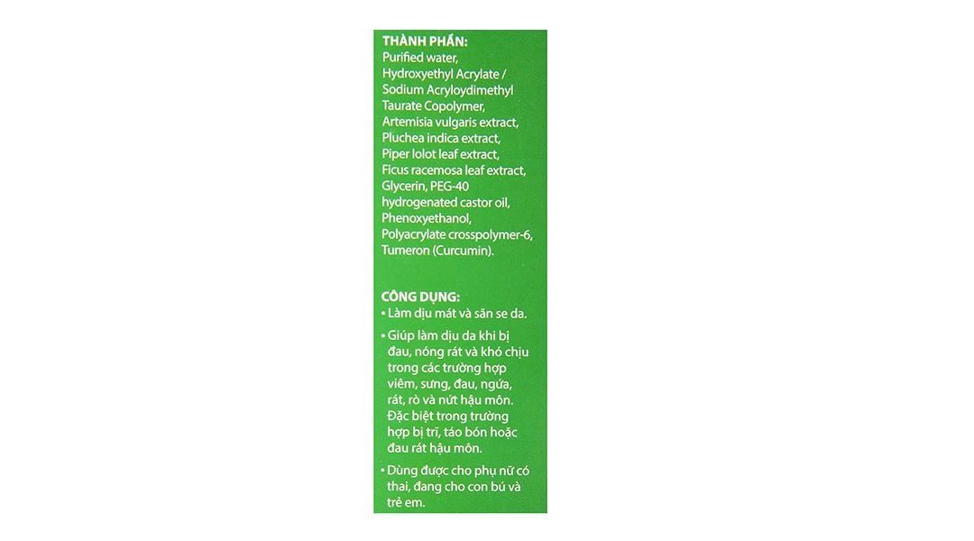 Công dụng | Làm dịu da, sưng, đau, rát, ngứa trong trường hợp người bị bệnh trĩ, táo bón. |