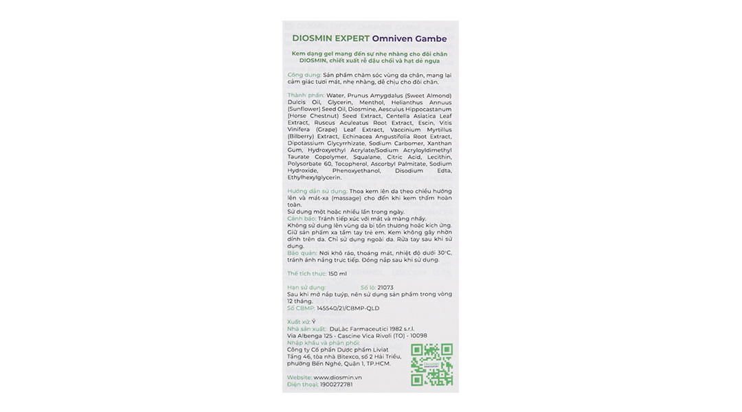 - Gel bôi Diosmin Expert hỗ trợ điều trị suy giãn tĩnh mạch tuýp 150ml