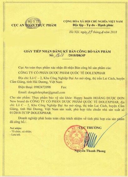 - Viên uống đã được Bộ Y Tế Việt Nam chứng nhận cấp phép lưu hành.