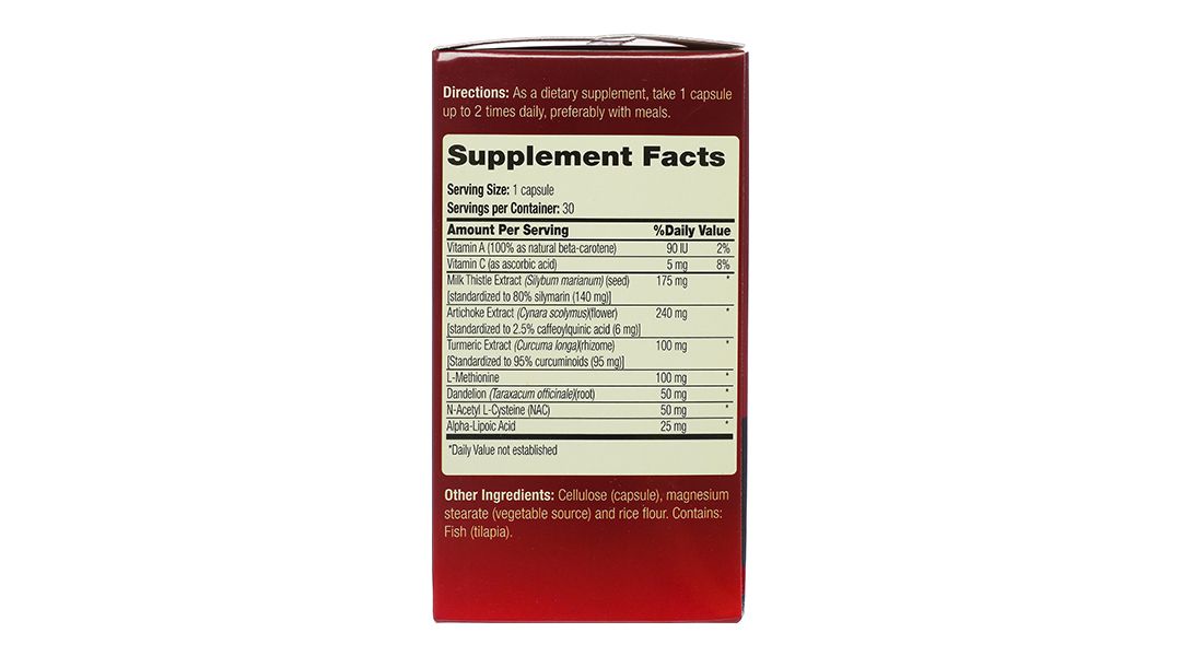 Vitamin A (100% as natural beta-carotene) 90IU, Vitamin C (as ascorbic acid) 5mg, Chiết xuất cây kế sữa (Silybum marianum) (hạt) [tiêu chuẩn hóa đến 80% silymarin (140 mg)] 175mg, Chiết xuất Actiso (Cynara scolymus)(hoa) [tiêu chuẩn hóa đến 2.5% axit caffeoylquinic (6 mg)] 240mg, Chiết xuất củ nghệ (Curcuma longa) (thân rễ) [tiêu chuẩn hóa đến 95% curcuminoids (95 mg)] 100mg, L-Methionine 100mg, Bồ công anh Taraxacum officinale) (rễ) 50mg, N-Acetyl L-Cysteine (NAC) 50mg, axit Alpha-Lipoic 25mg.