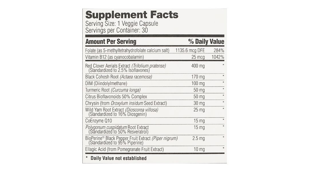Trong 1 viên nang cứng: Chiết Xuất Cỏ Ba Lá Đỏ (Trifolium pratense) (chuẩn hóa đến isoflavones 2,5%) 400mg, Rễ Cây Thiên Ma (Actaea racemosa) 170mg, DIM (diindolylmethane) 100mg, Củ nghệ (Curcuma longa) 50mg, Hỗn hợp Bioflavonoids họ cam chanh 50% 50mg, Chrysin (từ chiết xuất hạt núc nác 30mg, Chiết xuất khoai lang dại (Dioscorea villosa) (chuẩn hóa đến Diosgenin 16%) 25mg, CoEnzyme Q10 15mg, Chiết xuất rễ cây Polygonum cuspidatum (chuẩn hóa đến Resveratrol 50%) 15mg, Acid ellagic (từ chiết xuất lựu) 10mg, Chiết xuất quả tiêu đen (Piper nigrum) (chuẩn hóa đến Piperine 95%) 2,5mg, Folate (dưới dạng muối 5 - methyltetrahydrofolate canxi) 1135.6mcg DFE, Vitamin B12 (dưới dạng cyanocobalamin) 25mcg.
