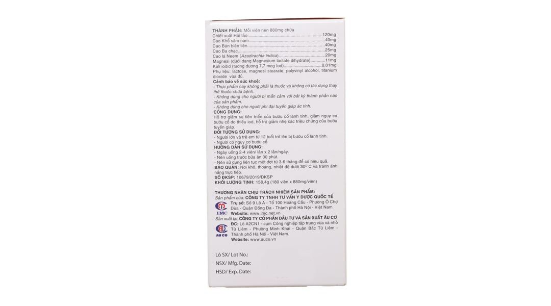 Mỗi viên nén 880mg chứa: Chiết xuất Hải tảo 120mg, cao Khổ sâm nam 40mg, cao Bán biên liên 40mg, cao Ba chạc 25mg, cao lá Neem (Azadirachta indica) 20mg, Magnesi (dưới dạng Magnesium lactate dihydrate) 11mg, Kali iodid (tương đương 7,7 mcg lod) 0,01mg.
