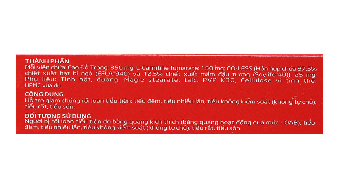 Cao Đỗ Trọng 350mg, L-Carnitine fumarate 150mg, Go-less (Hỗn hợp chứa 87,5% chiết xuất hạt bí ngô (Efla 940) và 12,5% chiết xuất mầm đậu tương (Soylife 40) 25mg.