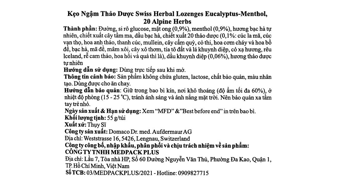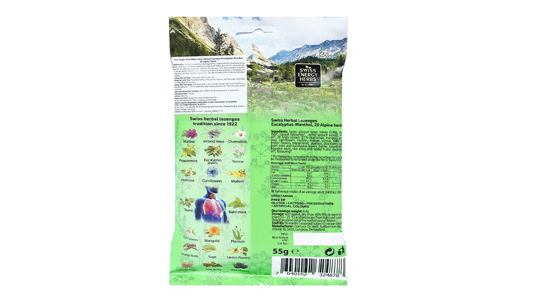 Swiss Herbal Lozenges Eucalyptus & Menthol Dùng được cho ăn chay.