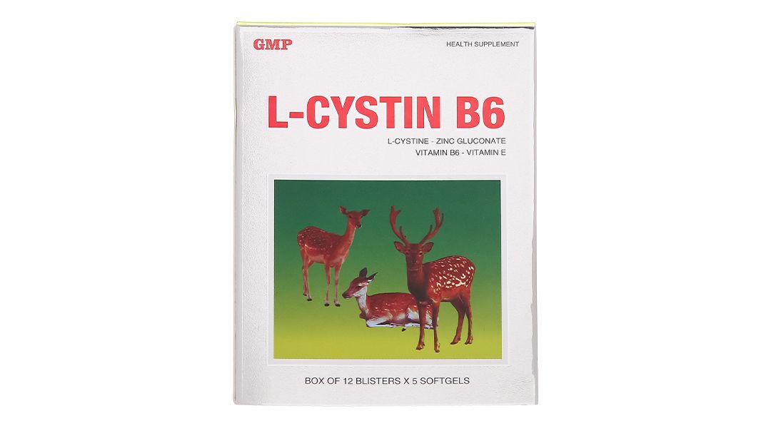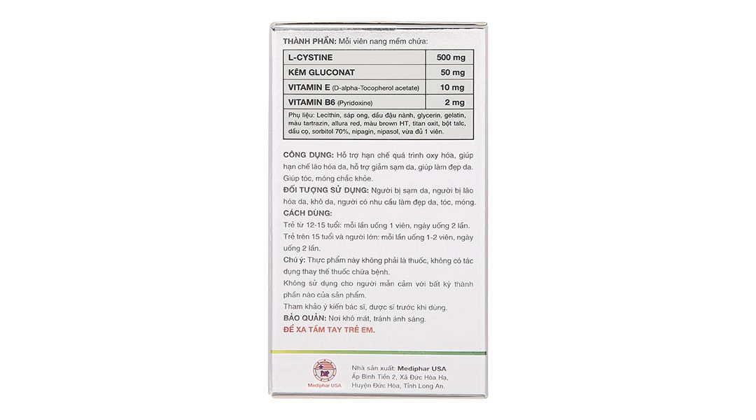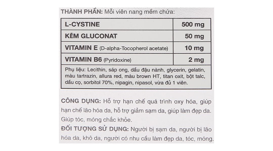 L-Cystine 500mg, Kẽm gluconat 50mg, Vitamin E (D-alpha-Tocopherol acetate) 10mg, Vitamin B6 (Pyridoxine) 2mg.