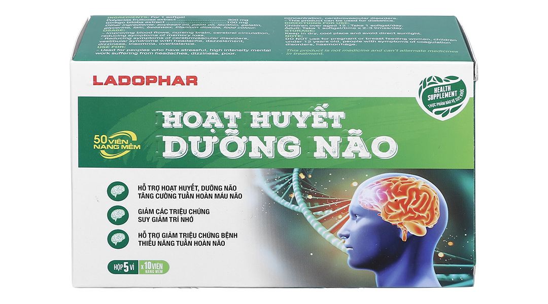 Hoạt huyết dưỡng não Ladophar với thành phần từ thảo dược có công dụng hoạt huyết, tăng cường tuần hoàn máu giúp giảm cảm giác đau đầu, hoa mắt, chóng mặt và tăng cường sự tập trung.