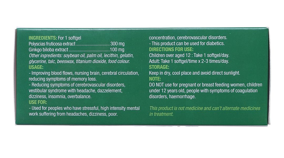 Công dụng | Tăng cường tuần hoàn máu não, trí nhớ, giảm triệu chứng thiểu năng tuần hoàn não. |