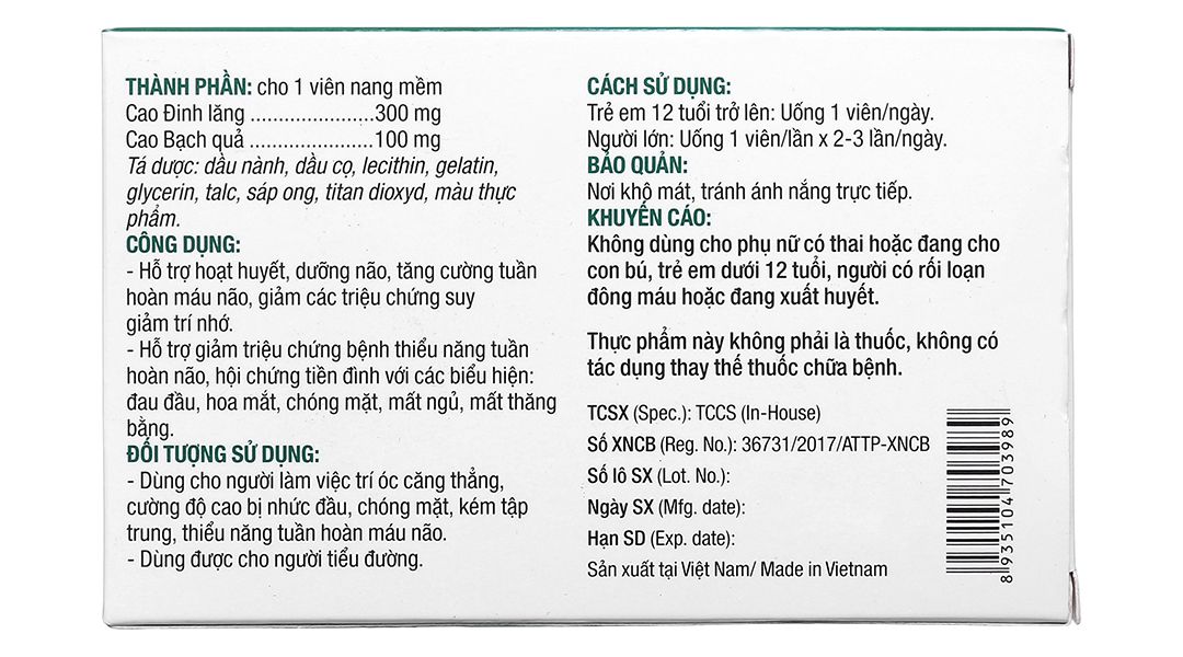 Thành phần chính | Cao Bạch quả, Cao Đinh lăng |