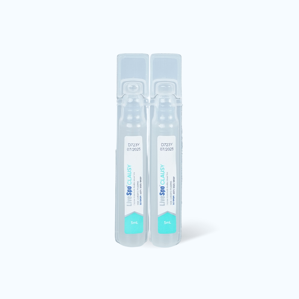 LiveSpo Clausy Bo Sung Men Vi Sinh chứa hơn 2 tỷ bào tử lợi khuẩn Bacillus Clausii và đủ nước cất trong ống 5 ml, giúp bổ sung men vi sinh có lợi cho đường ruột.