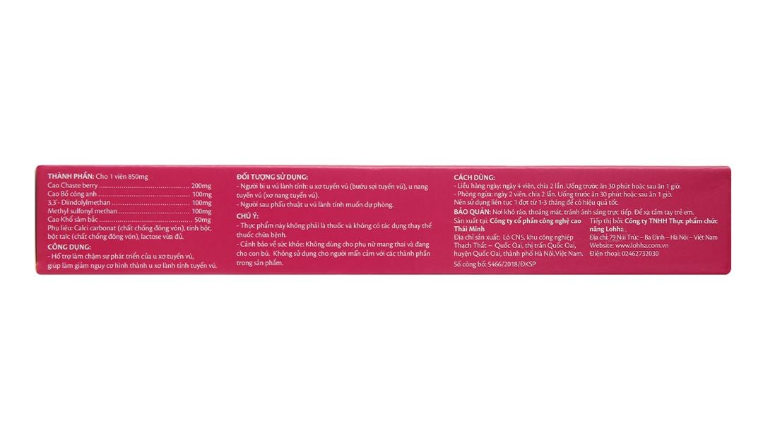Cao Chaster berry 200mg, Cao Bồ Công Anh 100mg, 3,3′ – Diindolylmethan 100mg, Methyl sulfonyl methan 100mg, Cao Khổ sâm bắc 50mg.