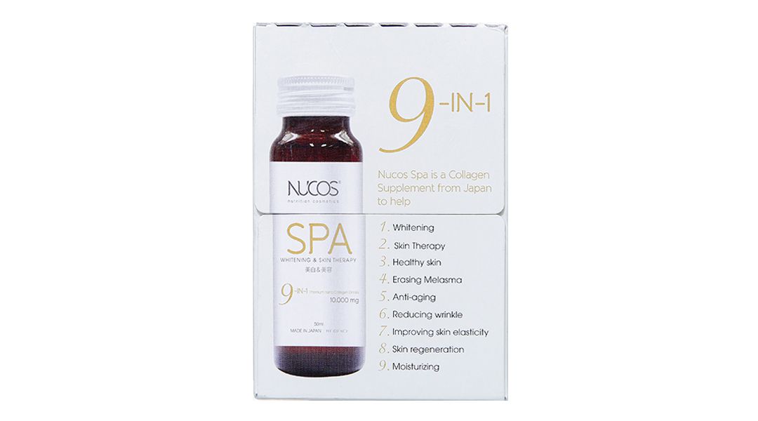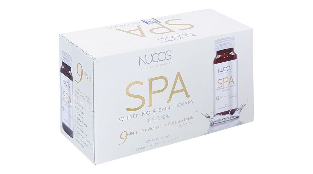 Nucos Spa 10.000 hộp 10 lọ xuất xứ từ Nhật Bản, với thành phần gồm collagen tự nhiên cùng vitamin E, vitamin C, coenzym Q10,... giúp tăng cường khả năng chống oxy hóa, giúp làm tăng độ đàn hồi cho da, làm giảm lão hóa da, giúp làm sáng da. Sản phẩm phù hợp cho người trưởng thành có nhu cầu chăm sóc da, muốn da sáng và giảm lão hóa.