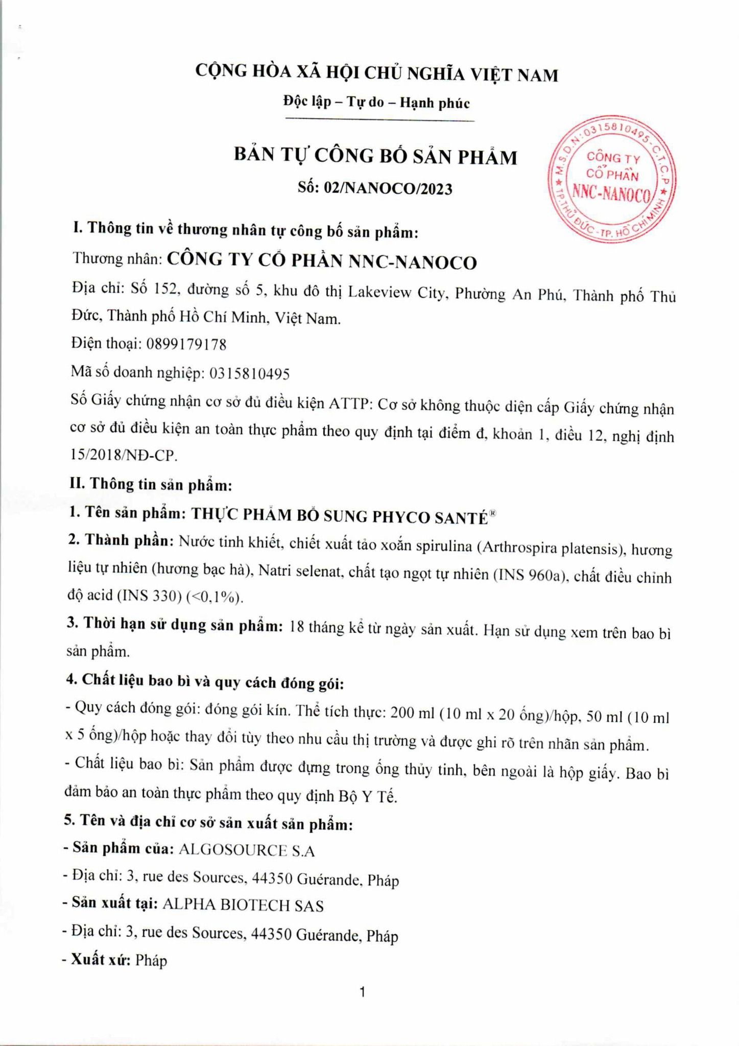 Thành phần: Nước tinh khiết, chiết xuất Phycocyanin từ tảo xoắn spirulina (Arthrospira platensis), hương liệu tự nhiên ( hương bạc hà), Natri selenat, chất tạo ngọt tự nhiên ( INS 960a), chất điều chỉnh độ acid ( INS 330) (<0,1%)