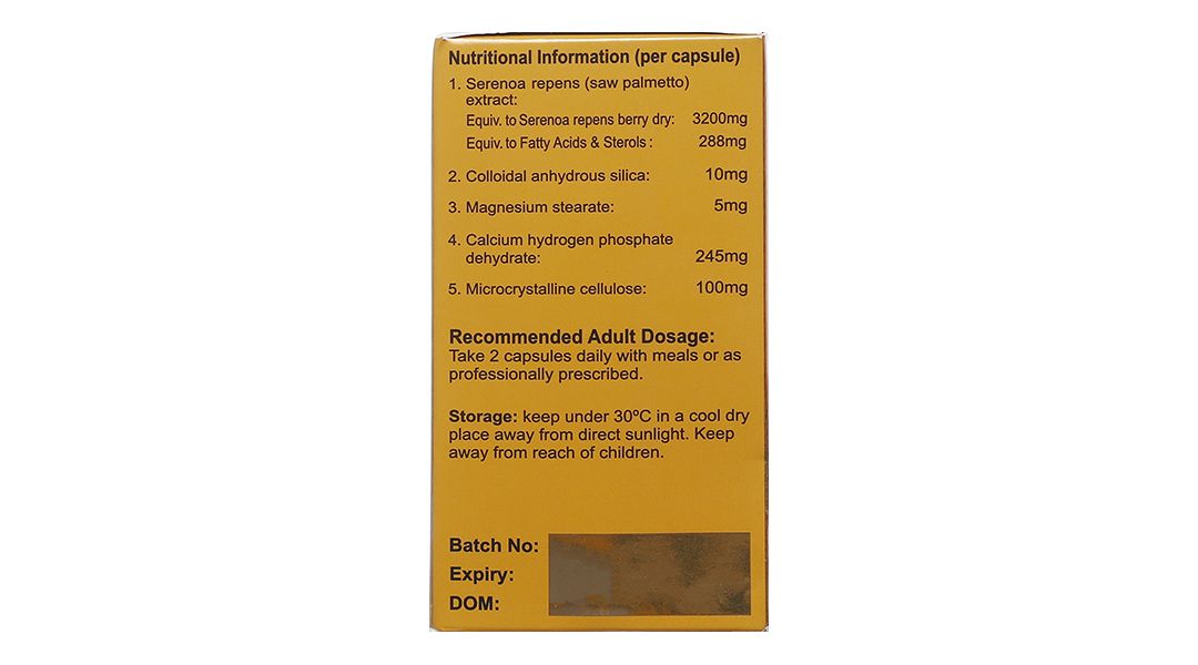 Thành phần cấu tạo 1 viên (k.l 798mg/viên): Serenoa repens (Saw Palmetto) extract: Equiv. Serenoa repens berry to dry: 3200mg. Equiv. Fatty Acids: 288mg, Colloidal anhydrous silica: 10mg, Magnesium stearate: 5mg, Calcium hydrogen Phosphate dehydrate: 245mg, Microcrystalline cellulose: 100mg.