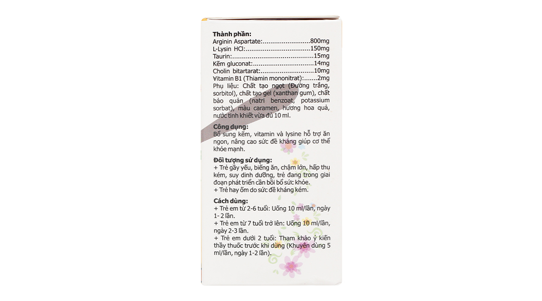 Công dụng | Bổ sung kẽm, vitamin và lysine hỗ trợ ăn ngon, nâng cao sức đề kháng. |
