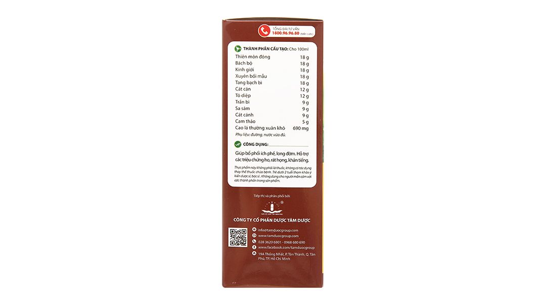 Thiên môn đông 18g, Bách bộ 18g, Kinh giới 18g, Xuyên bối mẫu 18g, Tang bạch bì 18g, Cát căn 12g, Tô diệp 12g, Trần bì 9g, Sa sâm 9g, Cát cánh 9g, Cam thảo 5g, Cao lá thường xuân khô 690mg.