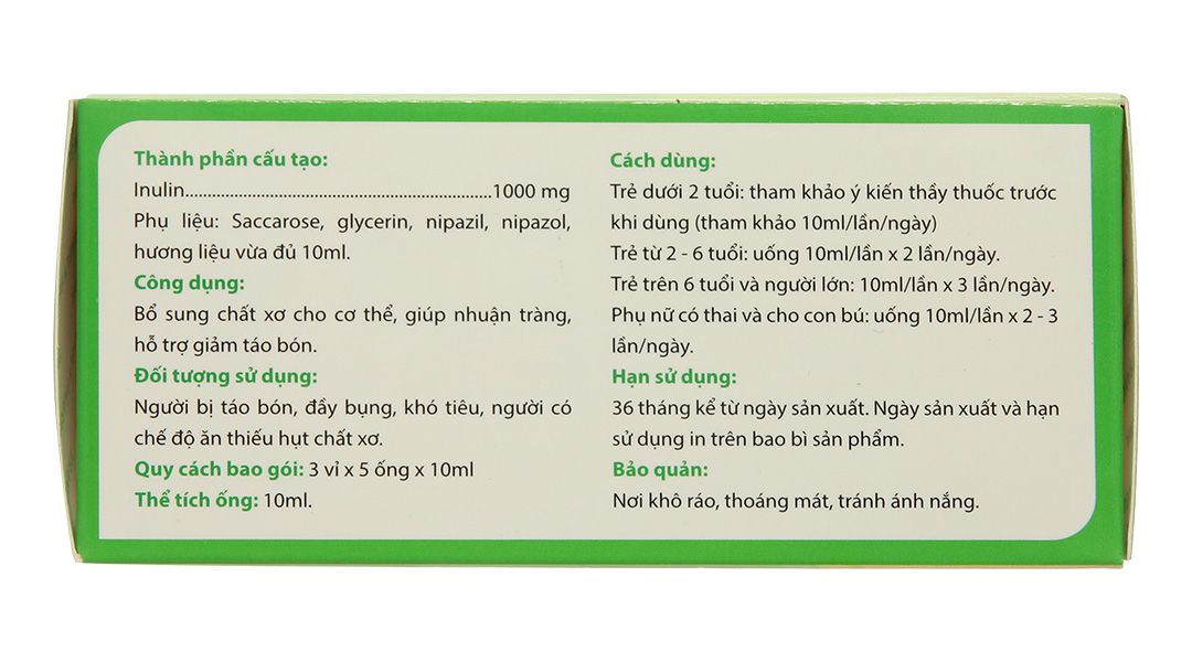 Đối tượng sử dụng | Người bị táo bón, đầy bụng, khó tiêu, người có chế độ ăn thiếu hụt chất xơ |
