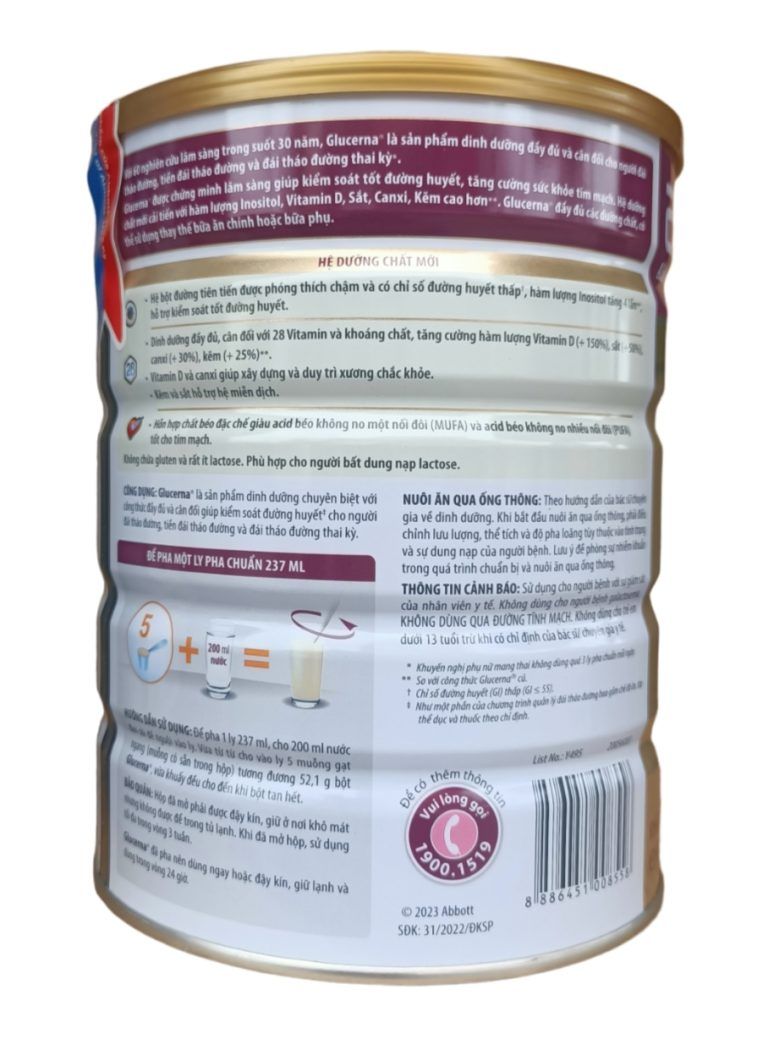 Sữa Glucerna với hệ bột đường giải phóng chậm gồm Crôm Picolinat và chỉ số đường huyết thấp, được chứng minh lâm sàng giúp kiểm soát đường huyết, và bổ sung dinh dưỡng cân bằng cho người đái tháo đường, Glucerna đáp ứng khuyến cáo của hội đái tháo đường Hoa Kỳ ( ADA ) và Châu Âu ( EASD ) về dinh dưỡng phù hợp cho người đái tháo đường.