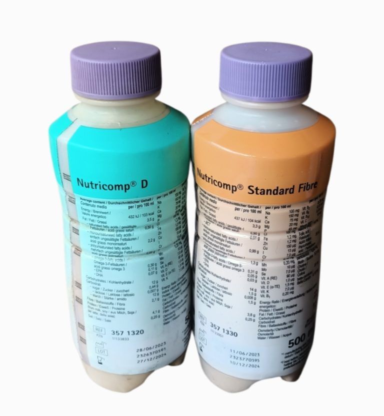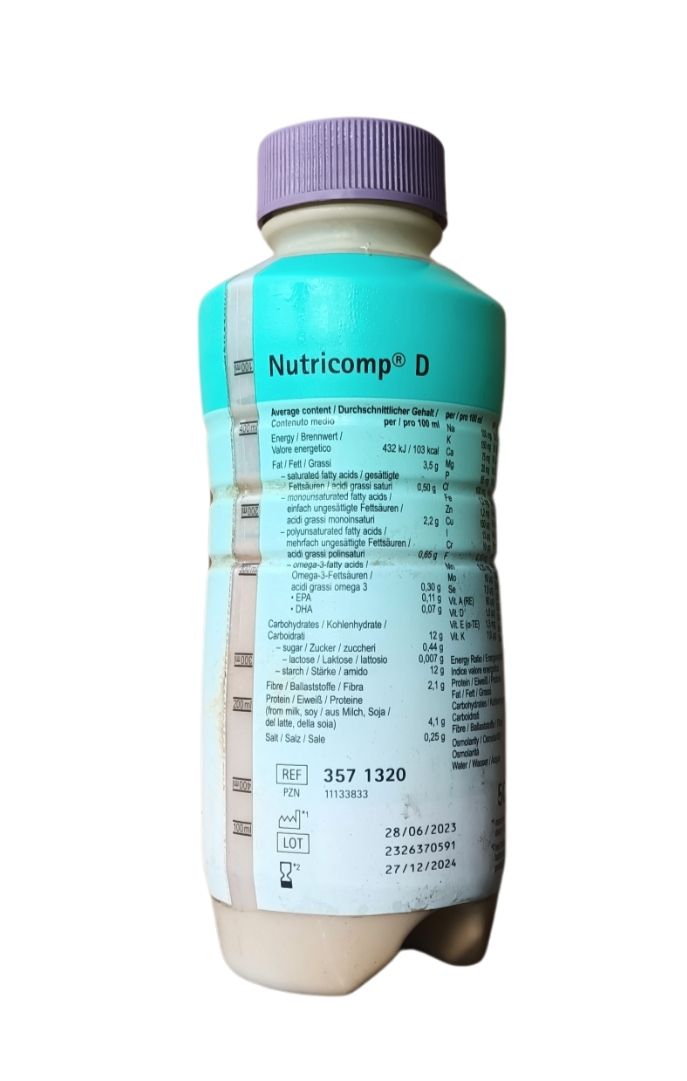 Nutricomp D là nguồn dinh dưỡng cao năng lượng 1kcal/ml. (500kcal/ chai). Tỷ lệ Protein – Chất béo – Carbohydrate. Chất xơ (15- 29- 53- 9).
