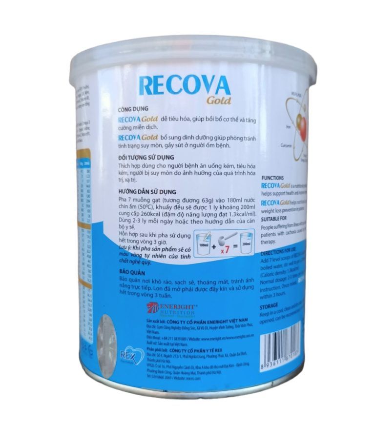 Sữa Recova Gold chứa các thành phần dinh dưỡng giàu protein, chất béo, năng lượng cao. Đặc biệt, sản phẩm còn chứa tinh chất nghệ, EPA, DHA rất thích hợp cho việc tăng thể trọng, tăng sức đề kháng, giúp ăn ngon miệng, tăng cường sức khỏe, giúp tiêu hóa tốt hơn, ngăn ngừa táo bón, hỗ trợ điều trị bệnh ung thư nhằm nâng cao chất lượng cuộc sống cho bệnh nhân.