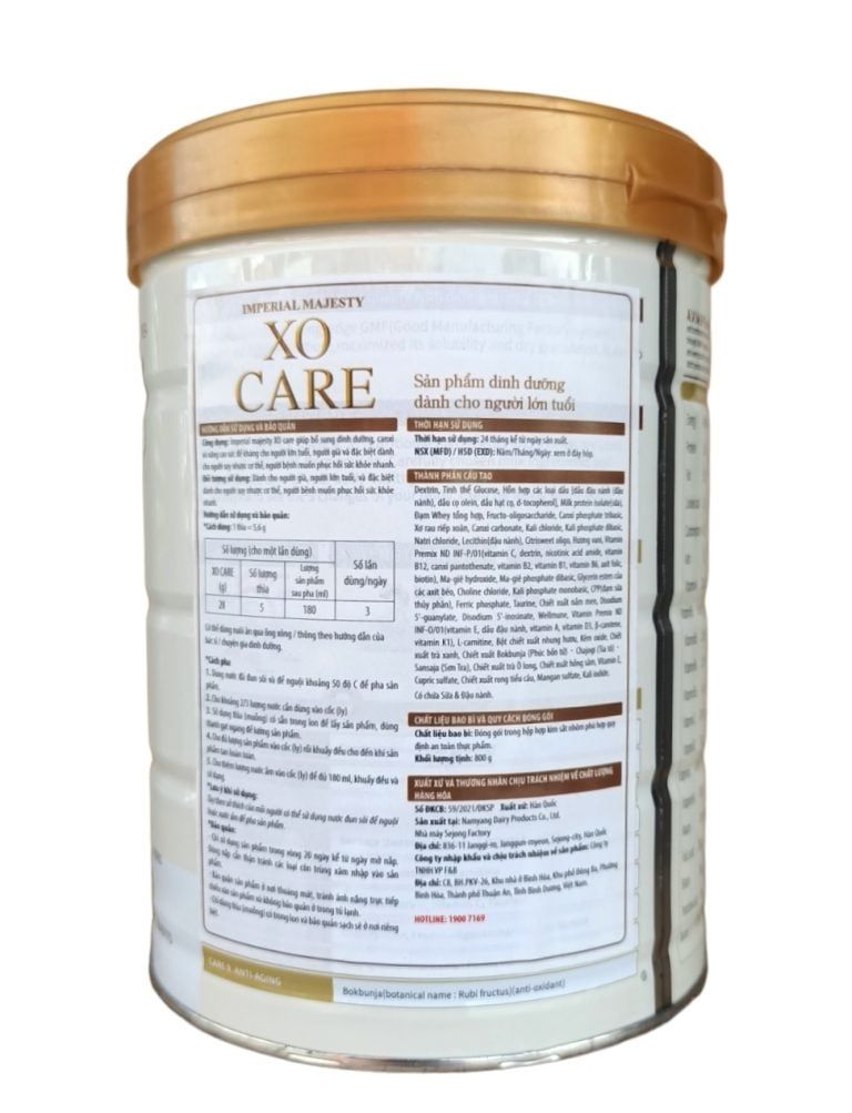 XO Care 99 Dinh dưỡng phương đông dành cho đối tượng thành niên. Người lớn tuổi và đặc biệt dành cho người suy nhược cơ thể. Được nhập khẩu nguyên lon từ tập đoàn Namyang – Hàn Quốc. Sản phẩm được làm từ sữa nguyên chất tách béo. Kết hợp với 9 loại thảo dược quý và 37 thành phần dưỡng chất. Mang đến 9 tác dụng tốt cho sức khỏe.