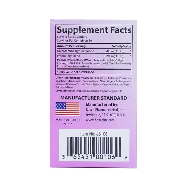 - Hỗn hợp các dược liệu 1194 mg (1.1g) gồm: Methylsulfonylmethane (MSM), Chondroitin Sulfate, Collagen (Hydrolyzed Gelatin), Boswellia serrata (resin), Citrus bioflavonoids extract (Citrus Lemon) (Fruit)
