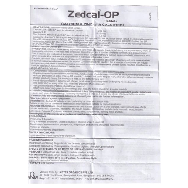 Ở liều tối thiểu khuyến cáo Zedcal-OP dung nạp tốt. Dấu hiệu sớm của các phản ứng phụ bao gồm: Yếu, chóng mặt, đau đầu, khô miệng, buồn nôn, táo bón, miệng có vị kim loại, đau cơ.