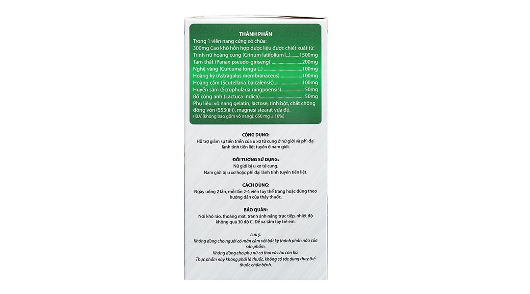 Trinh nữ hoàng cung (Crinum latifolium L) 1500mg, Tam thất (Panax pseudo-ginseng) 200mg, Nghệ vàng (Curcuma longa L) 100mg, Hoàng kỳ (Astragalus membranaceus) 100g, Hoàng cầm (Scutellaria baicalensis) 100mg, Huyền sâm (Scrophularia ningpoensis) 50mg, Bồ công anh (Lactuca indica) 50mg.
