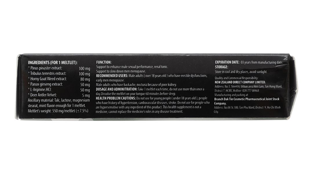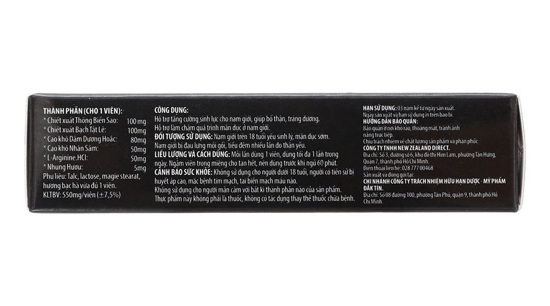 Chiết xuất Thông Biển Sao 100mg, Chiết xuất Bạch Tật Lê 100mg, Cao khô Dâm Dương Hoắc 80mg, Cao khô Nhân Sâm 50mg, L-Arginine.HCL 50mg, Nhung Hươu 5mg.