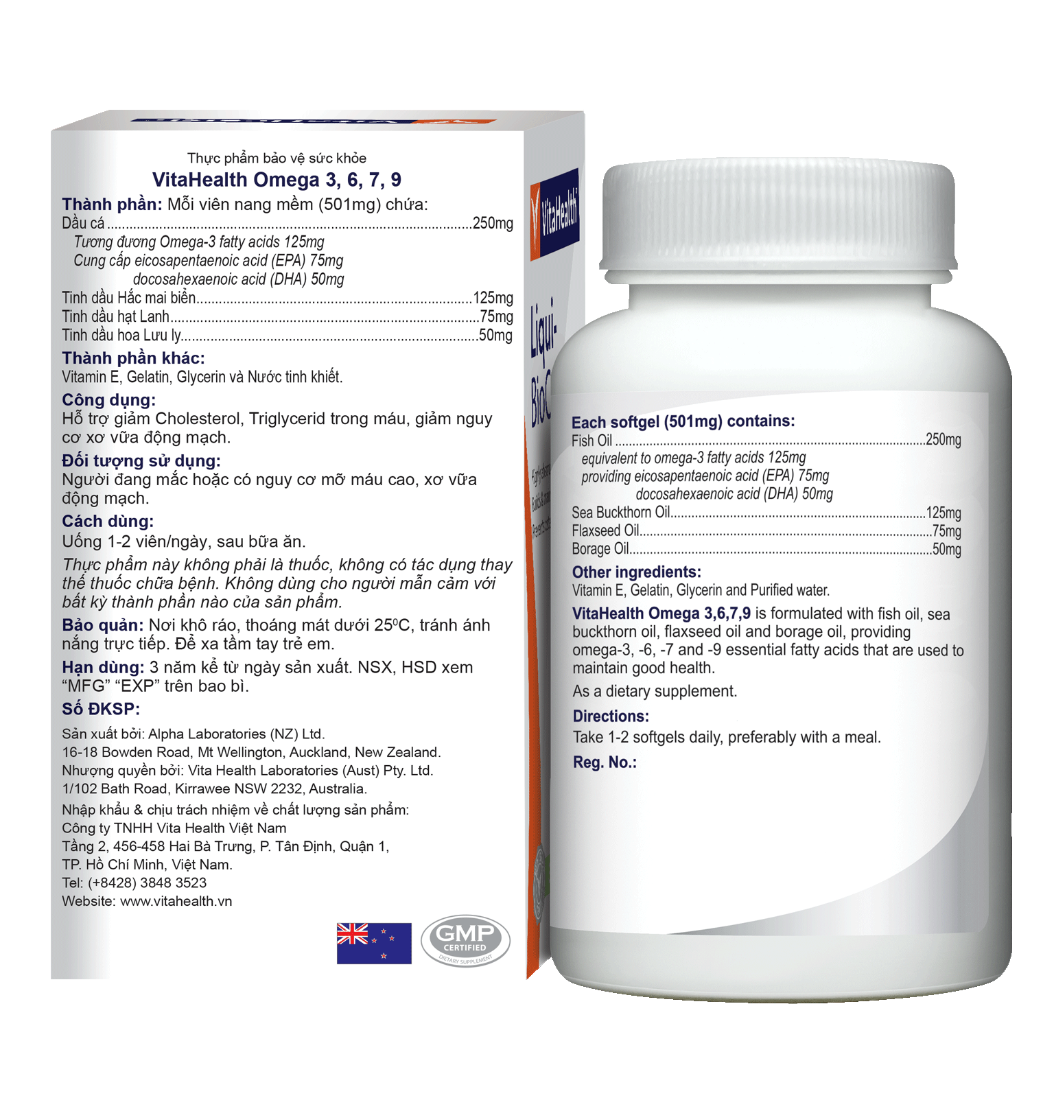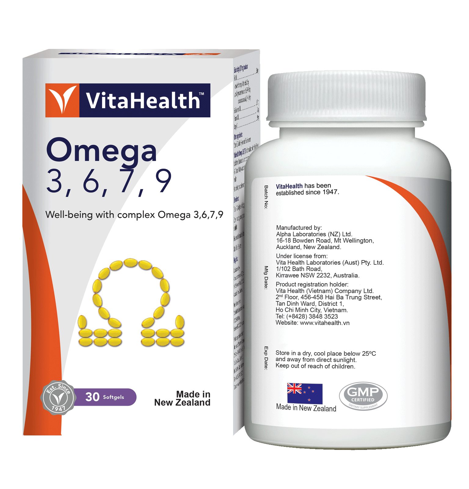 VitaHealth Omega 3,6,7,9 là sản phẩm giúp hỗ trợ sáng mắt, bảo vệ tim mạch, chống oxy hóa cao, giúp duy trì trí nhớ, ổn định tâm lý, tăng cường miễn dịch. Sản phẩm được bào chế dưới dạng viên nang mềm và đóng gói theo quy cách hộp 100 viên nang mềm.