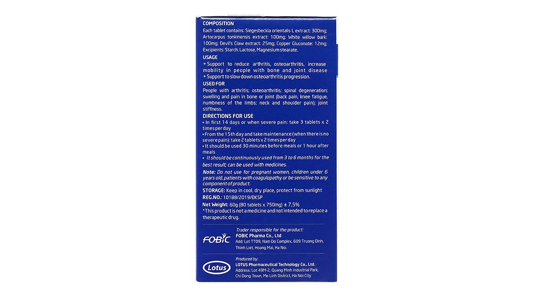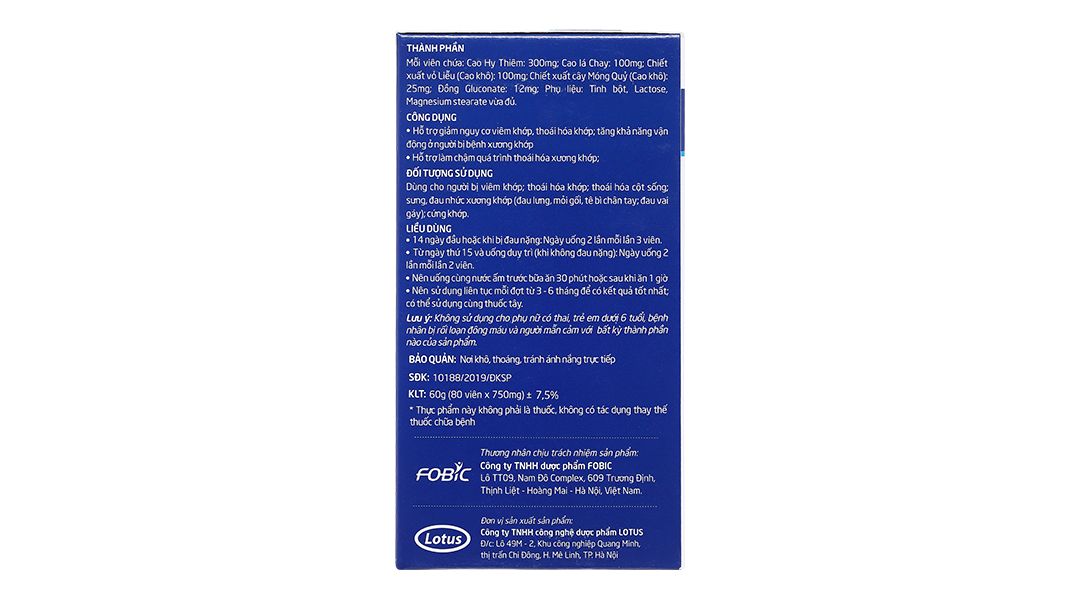 Đối tượng sử dụng | Người bị viêm khớp, thoái hóa khớp, thoái hóa cột sống: sưng, đau nhức xương khớp |