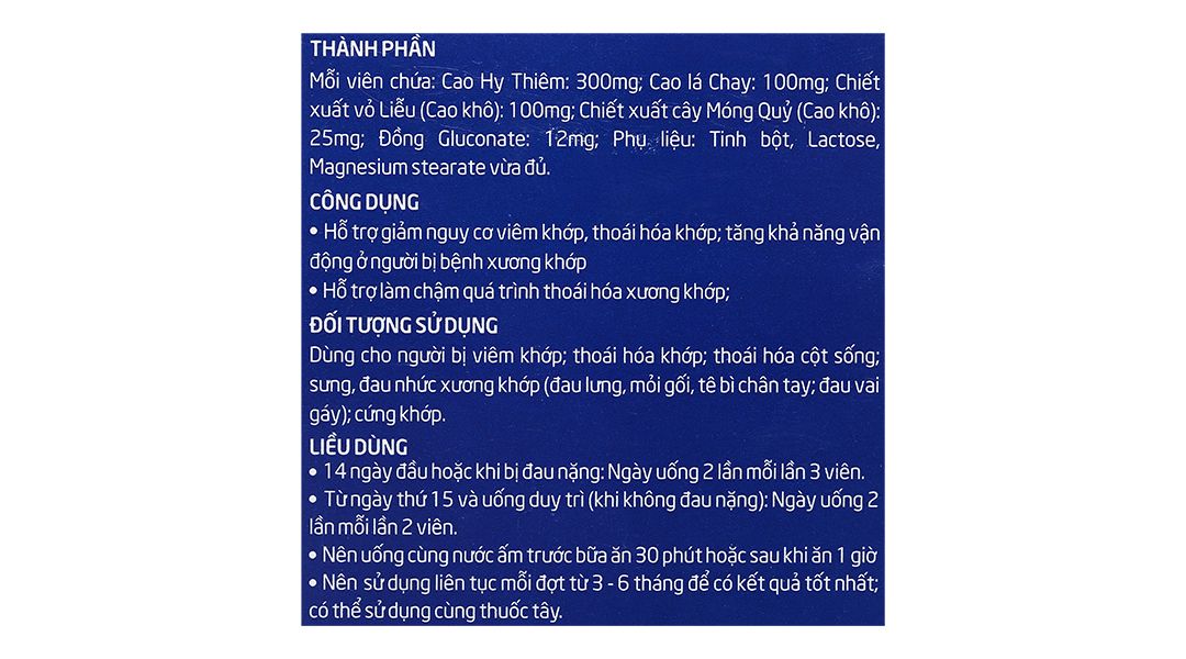 Cao Hy Thiêm 300mg, Cao lá chay 100mg, Chiết xuất vỏ Liễu (Cao khô) 100mg, Chiết xuất cây Móng Quỷ (Cao khô) 25mg, Đồng Gluconate 12mg.